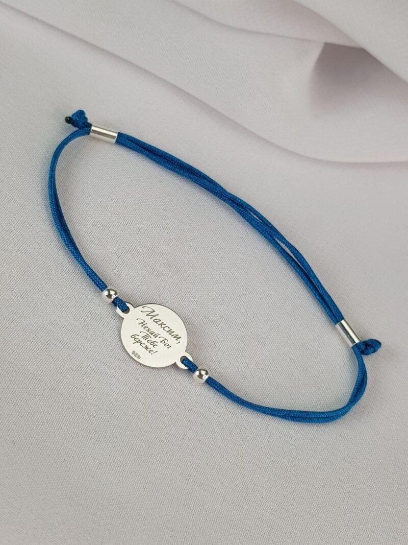 Срібний браслет на шовковій ниточці. Гравіювання: метрики, імена, дати, побажання, слова підтримки — виконаймо будь-яке Ваше замовлення.