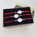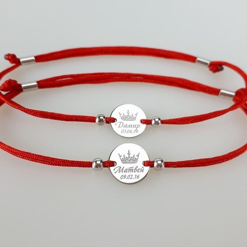Серебряный браслет на шелковой ниточке. Гравировка: метрики, имена, даты, пожелания, слова поддержки – выполним любой Ваш заказ.