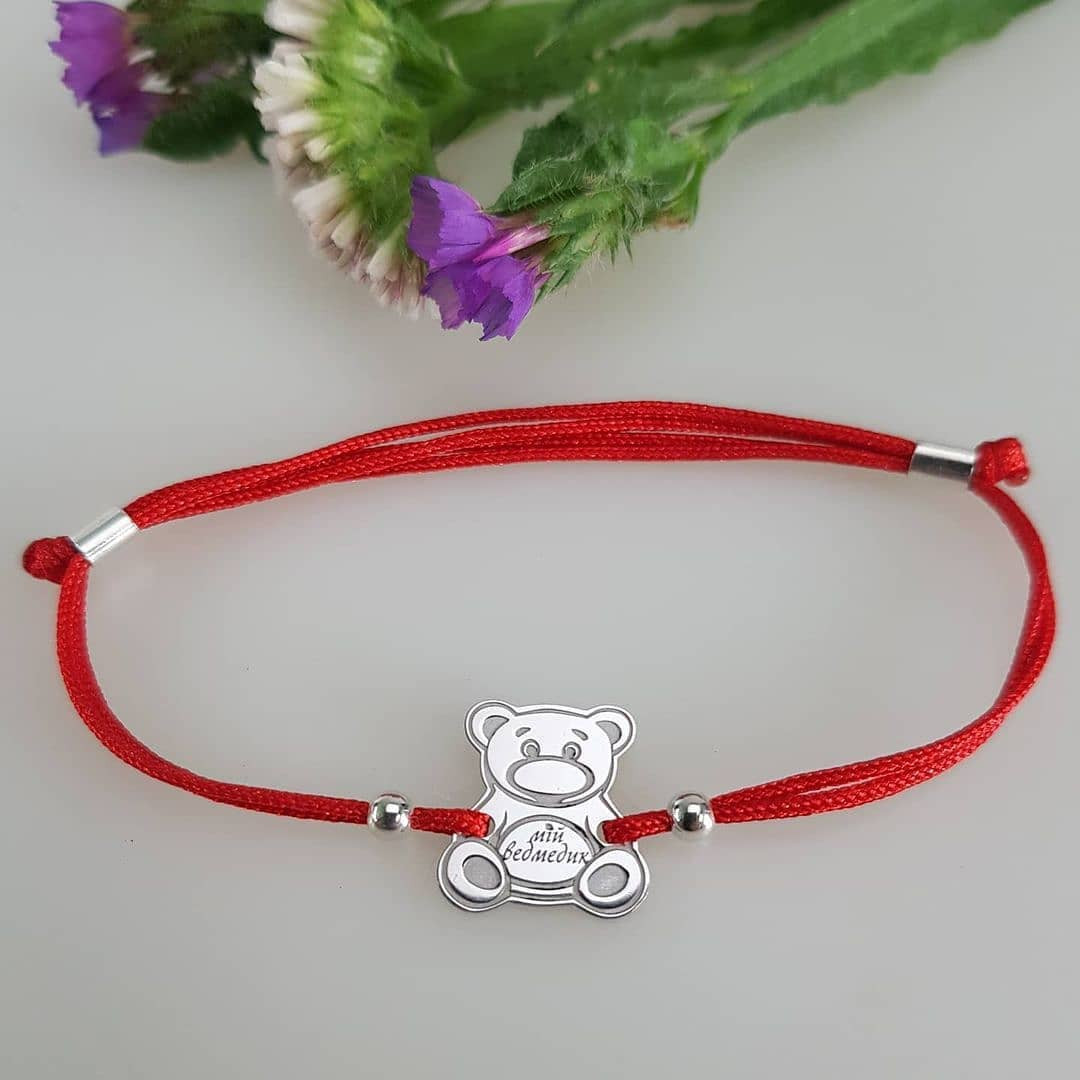 Срібний браслет на шовковій ниточці. Гравіювання: метрики, імена, дати, побажання, слова підтримки — виконаймо будь-яке Ваше замовлення.