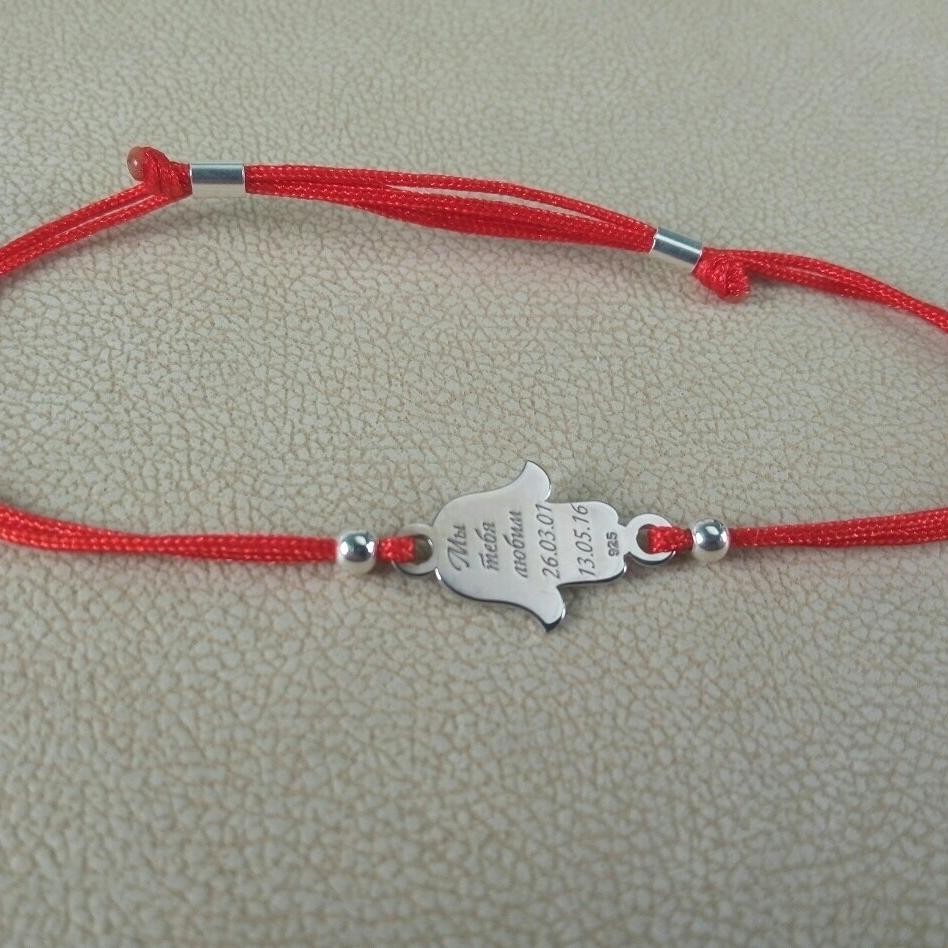Срібний браслет на шовковій ниточці. Гравіювання: метрики, імена, дати, побажання, слова підтримки — виконаймо будь-яке Ваше замовлення.