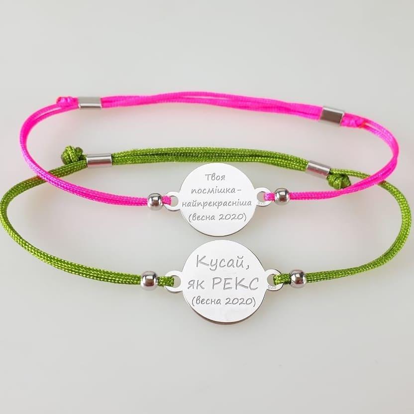 Срібний браслет на шовковій ниточці. Гравіювання: метрики, імена, дати, побажання, слова підтримки — виконаймо будь-яке Ваше замовлення.