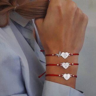 Серебряный браслет на шелковой ниточке. Гравировка: метрики, имена, даты, пожелания, слова поддержки – выполним любой Ваш заказ.