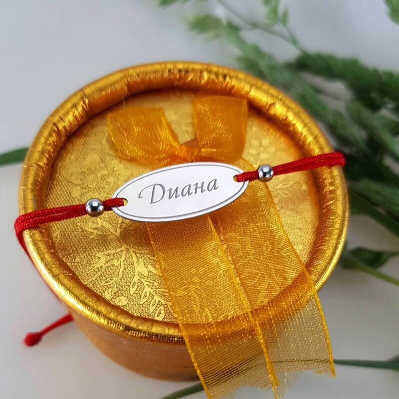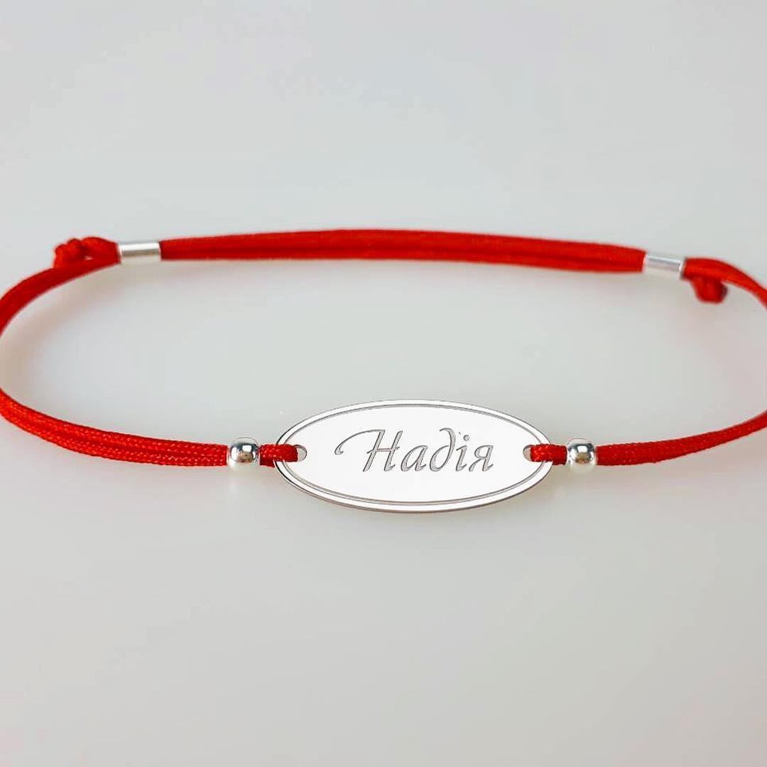 Срібний браслет на шовковій ниточці. Гравіювання: метрики, імена, дати, побажання, слова підтримки — виконаймо будь-яке Ваше замовлення.