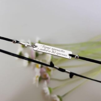 Срібний браслет на шовковій ниточці. Гравіювання: метрики, імена, дати, побажання, слова підтримки — виконаймо будь-яке Ваше замовлення.